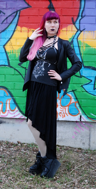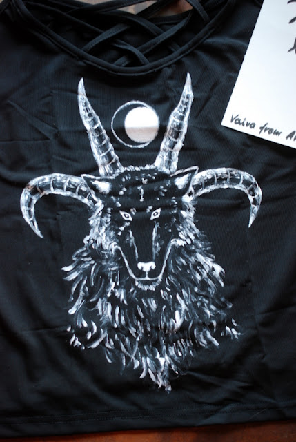 What’s inside, you ask? I brand new black harnessed top with Mystic Master design! What Vaiva does is that she uses the same sketch, but paints each picture by hand, so no two are similar. I’m really a big fan of painting by hand, I went to art school and have a soft spot for the extra work that goes into painting. Unique pieces with personal touches by the artist are wonderful! The themes of the designs are occult and nature related, and have Vaiva’s touch on them, creating a lovely mystical atmosphere. I love forests and am interested in old pagan traditions of nature worship, so I feel like there designs speak to me. There is something very Nordic in them.