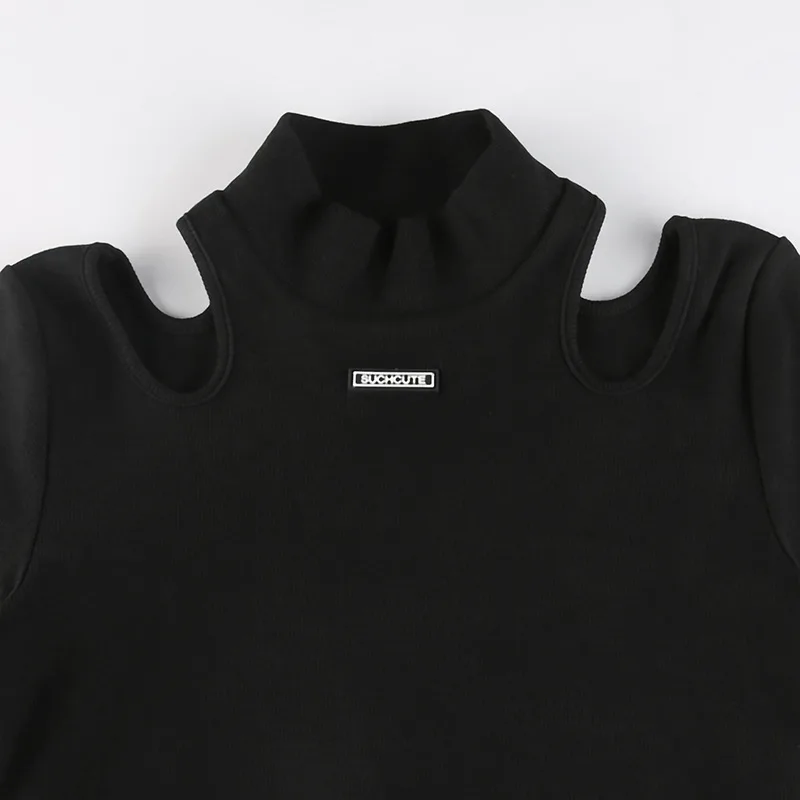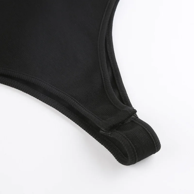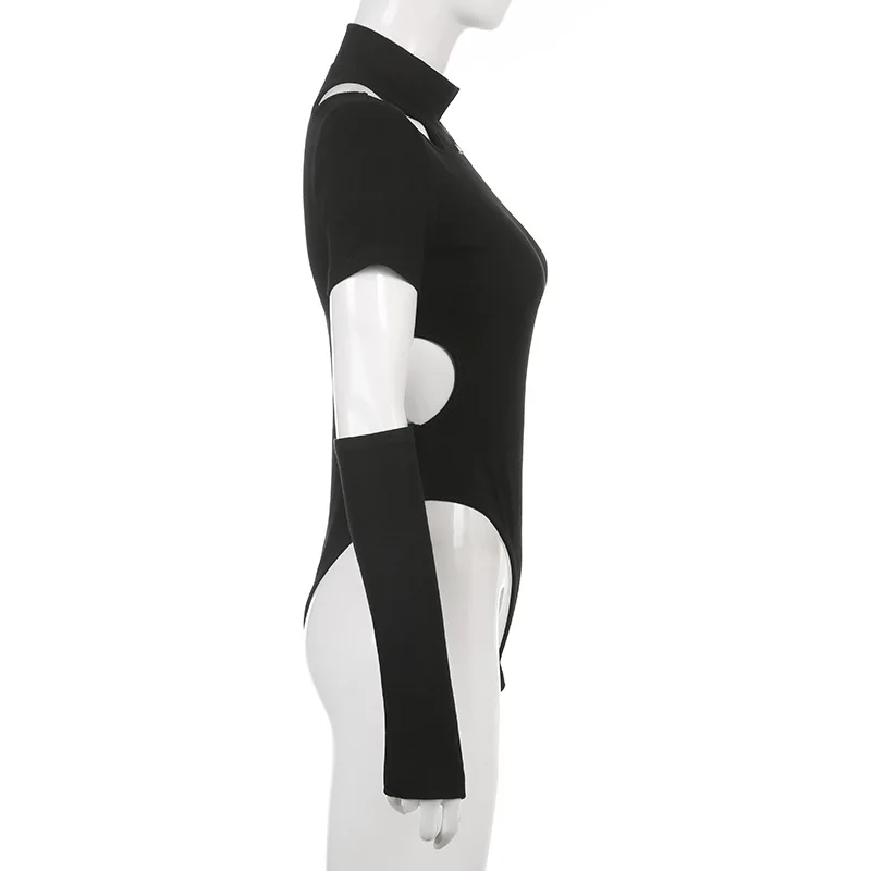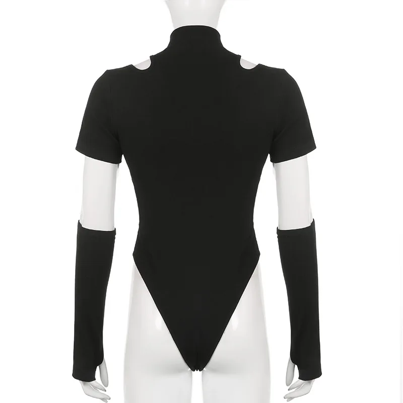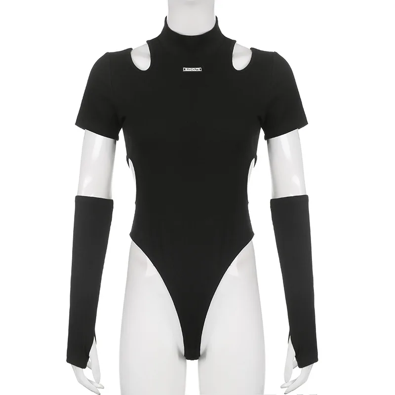 Women Bodysuits Gothic Y2k Black Cut Out Sexy Tops With Gloves Grunge Fashion Streetwear