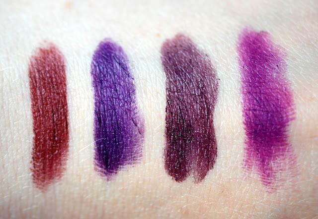 From left to right: Sugarpill Anti-Socialite, Sugarpill Darksided, Mac Cyber and Urban Decay Pandemonium.Here’s a side by side comparison with some lipsticks I though might be close to Darksided. Mac Cyber looks like a blend between Anti-Socialite and Darksided, it’s a lot more plum toned than Darksided. Urban Decay has lots of great purples in their new lipstick line, but Pandemonium looked like the closest match, but it’s not at all close. So yay, I managed to buy a purple lipstick that does not look like my other purple lipsticks, go me!I have to say I am happy I got these lipsticks. I’ve been using wax-based lippies to touch up liquid-to-mattes during the day, as they moisturize better and don’t create the crumbling effect that sometimes happens when you try to add some more liquid-to-matte to the center of the lips and end up with a too thick layer. And just looking at the glittery packaging makes me happy!